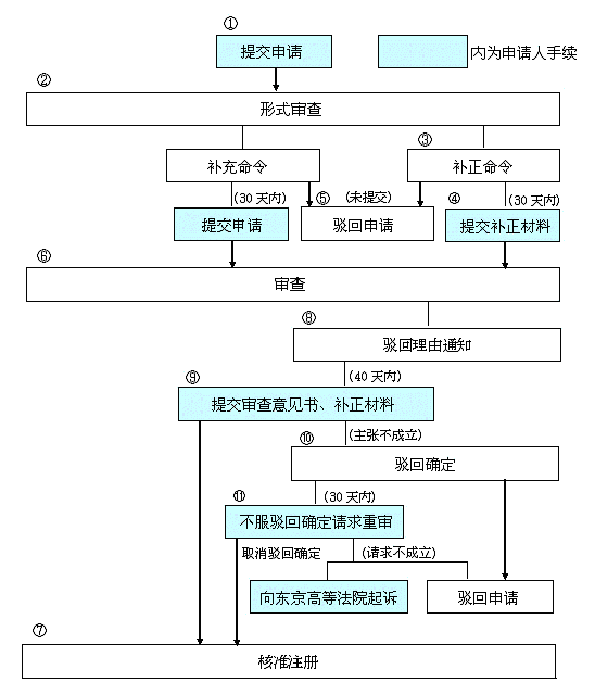 ⑩中駁回理由未被解除,將被確定駁回,向申請人發(fā)出駁回確定副本。申請人對駁回確定有異議時,可在駁回確定副本發(fā)送日起30天內(nèi)申請復(fù)審。